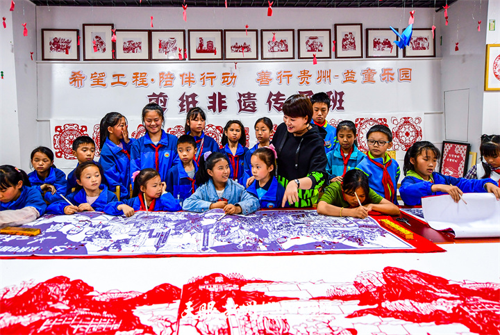 小朋友們在習(xí)水縣東皇街道東風(fēng)湖社區(qū)益童樂園剪紙非遺訓(xùn)練班學(xué)習(xí)剪紙。貴州日報(bào)天眼新聞?dòng)浾?陳慧 攝